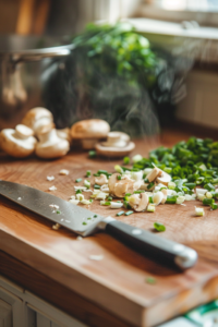 1. Finely chop the garlic, slice the mushrooms, and prepare the green onions so everything is ready before the cooking begins.