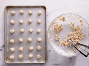 4. Shape the Cookies: Roll dough into walnut-sized balls and place them 2 inches apart on ungreased baking sheets.