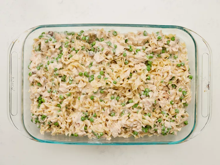 Mix the Base: Combine noodles, soup, tuna, peas, and milk.