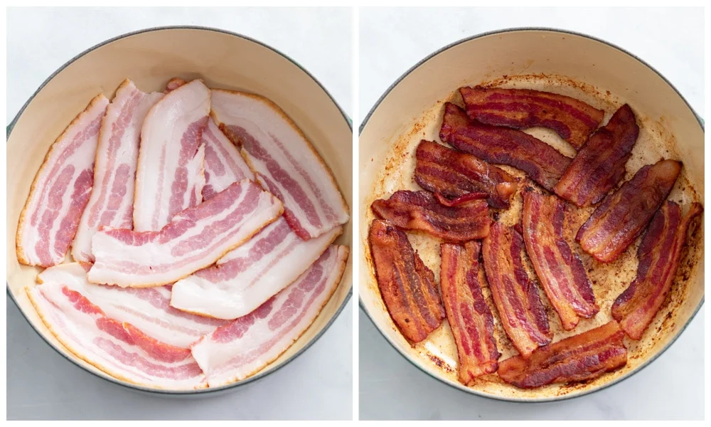 • Cook the bacon slowly: In a large soup pot over low heat, cook the bacon until crisp. Don’t rush this. Set it aside once done and save about 2 tablespoons of the drippings.
