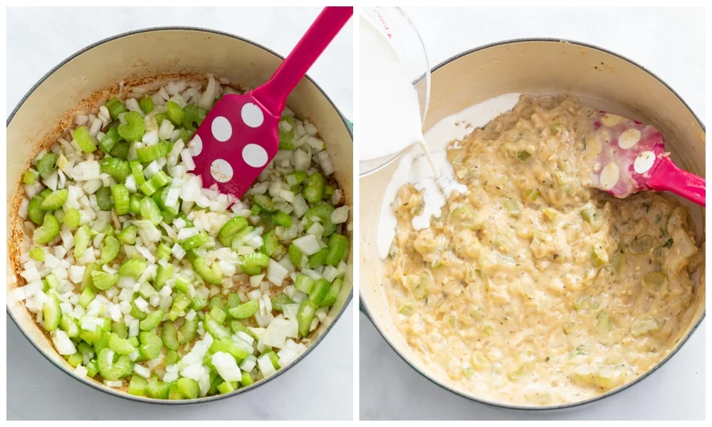 • Start the base: Add the reserved drippings and butter to the pot over medium heat. Toss in diced onion and celery. Let them soften for about 5 to 6 minutes.