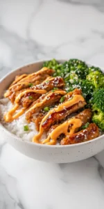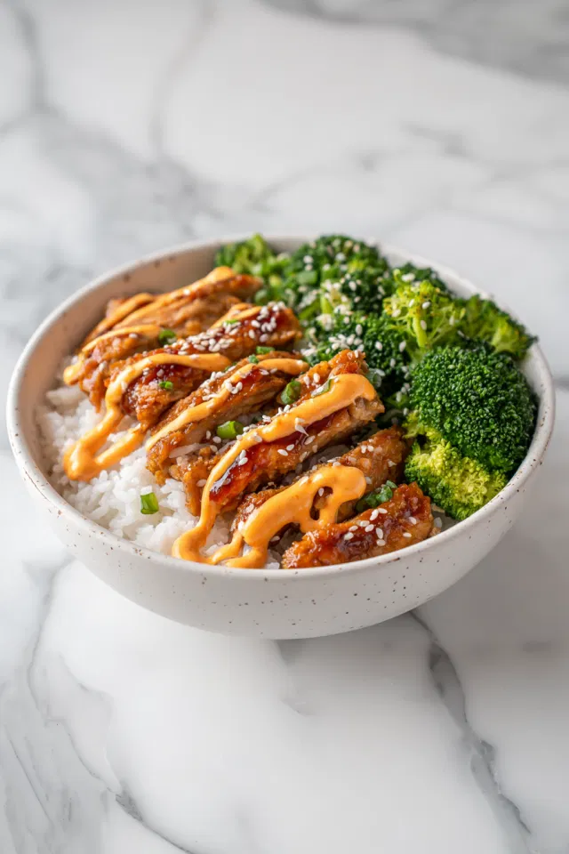 A cozy and flavorful chicken rice bowl loaded with tender broccoli, sticky seasoned chicken, and a creamy spicy mayo drizzle for comfort.