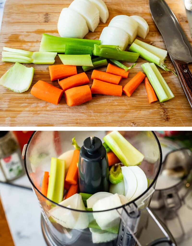 Add onion, carrots, and celery to a food processor and pulse until finely chopped. If not using one, chop everything very finely by hand.