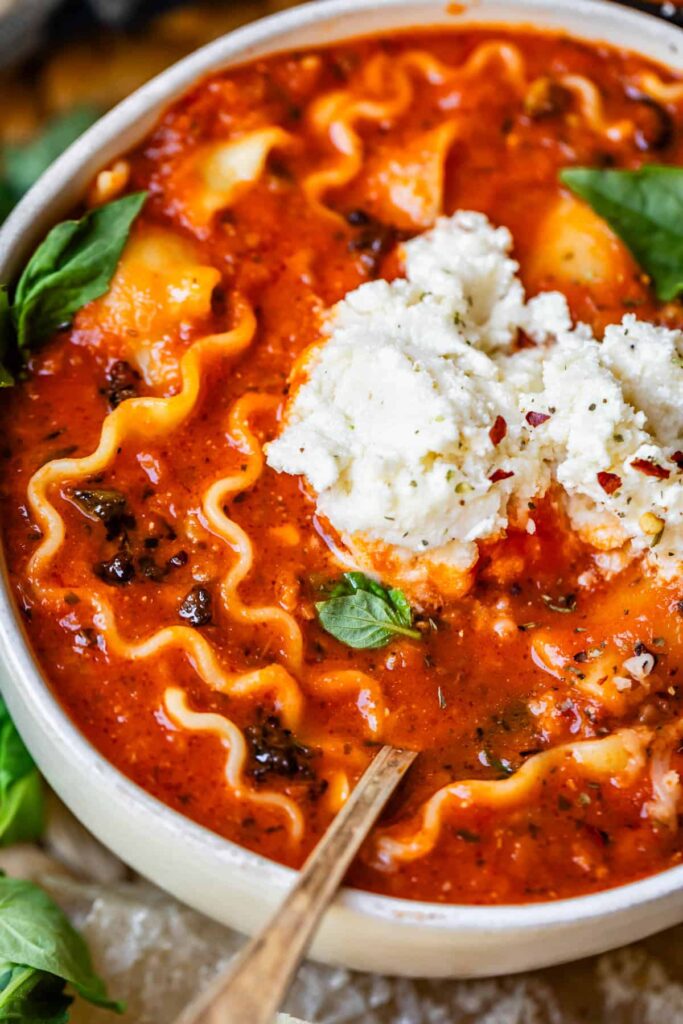A rich, comforting lasagna soup loaded with sausage, tomatoes, herbs, and creamy ricotta topping—bringing all the classic lasagna flavors into a warm, hearty, spoonable bowl.