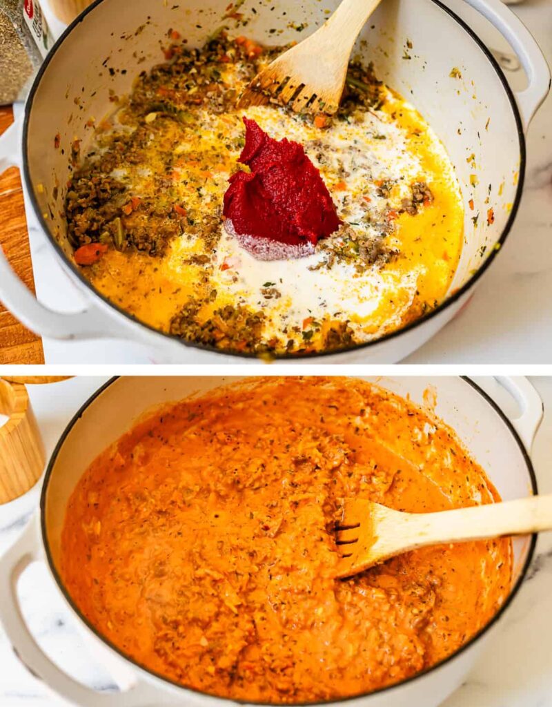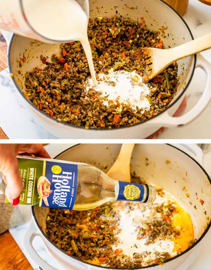 Step 5: Stir in wine, cream, and tomato paste. Simmer for 5 minutes.