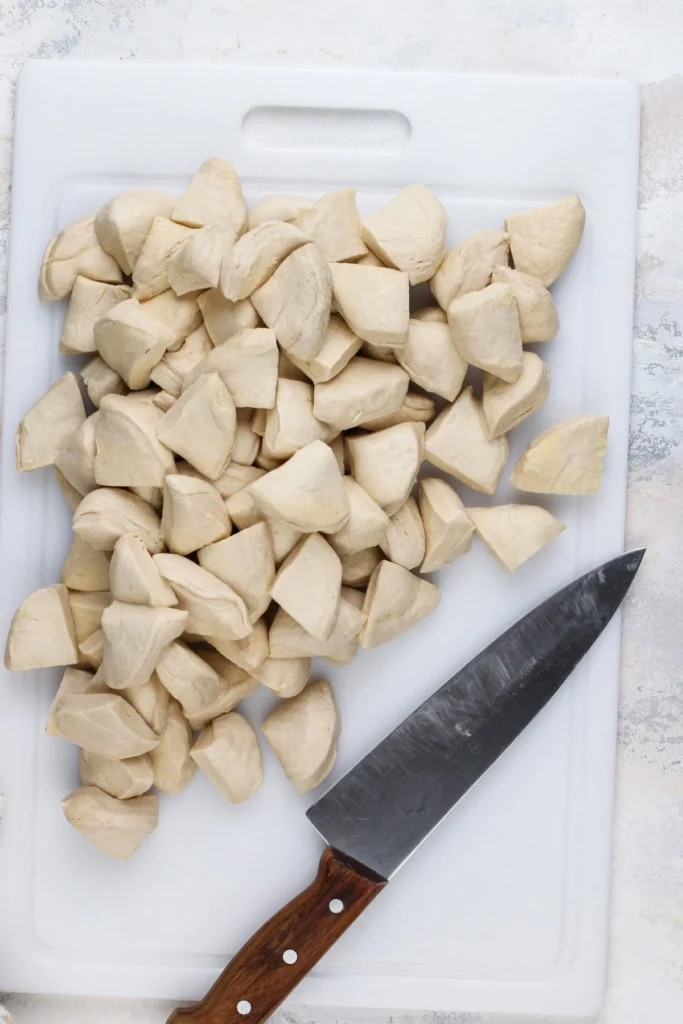 Open the cans of biscuits and cut each biscuit into quarters using a sharp knife.