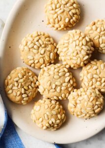 Delicate almond cookies coated in crunchy pine nuts, lightly golden and chewy inside, offering a classic Italian-style treat with rich almond flavor in every bite.