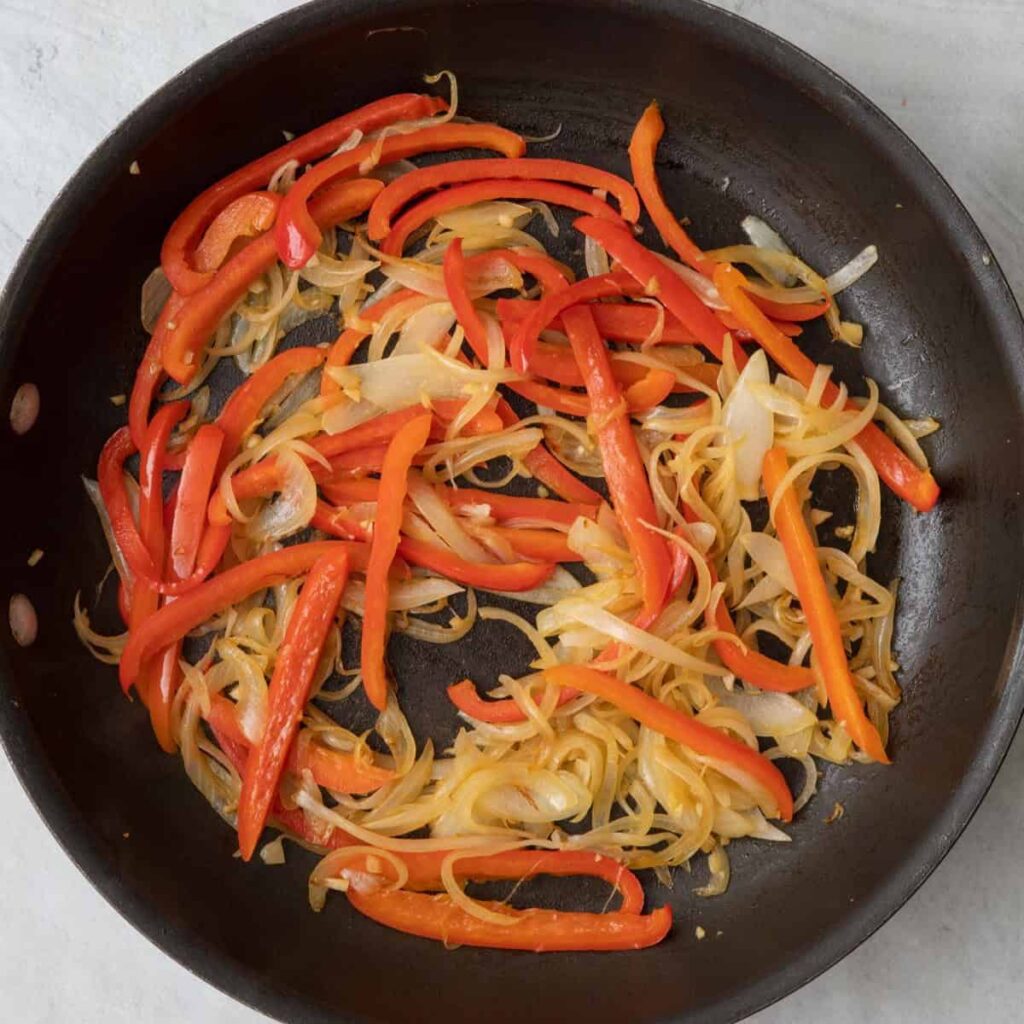 1. Heat olive oil in a large skillet over medium heat. Add the sliced onions and bell peppers, cooking for about 10 minutes until soft and translucent.