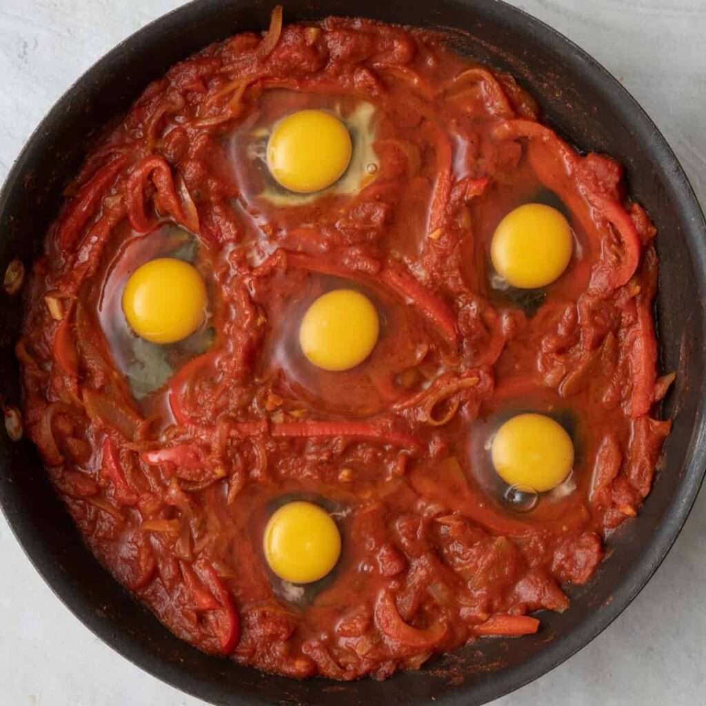 Add the Eggs: Make small wells in the sauce and crack the eggs into them.