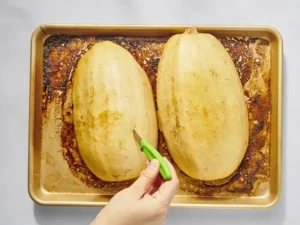 Place the spaghetti squash halves cut-side down on the sheet and bake for about 30 minutes, until a knife slides in easily. Remove from the oven and let it cool just enough to handle comfortably.