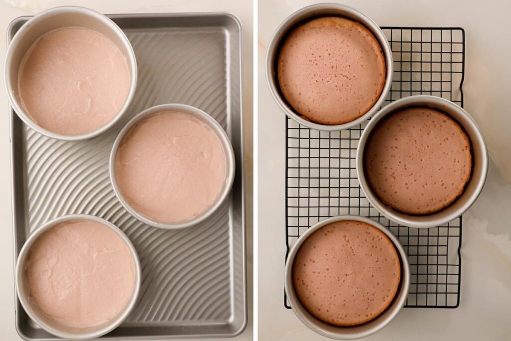 Divide the batter evenly between pans and bake until lightly golden and set.