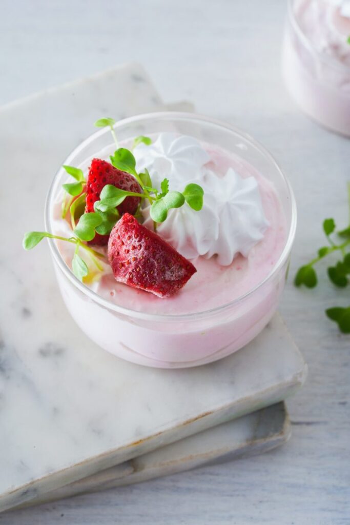 Light and creamy strawberry yogurt mousse, gently sweetened and set with gelatin, layered with fresh berries for a refreshing dessert.