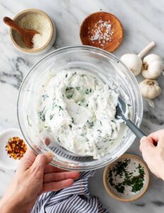 In a medium bowl, mix the chopped spinach with ricotta, pecorino, garlic, oregano, lemon zest, red pepper flakes, salt, and a few grinds of black pepper until well combined.