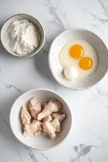 Step 1: Pour 1–2 inches of oil into a deep skillet and heat to 350°F (175°C). Cut the chicken breast into bite-sized pieces and set aside.