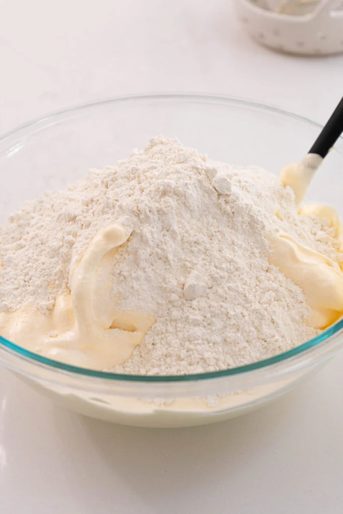 In a small bowl, mix together the flour and baking powder. Gently fold this mixture into the batter just until combined. Do not overmix.