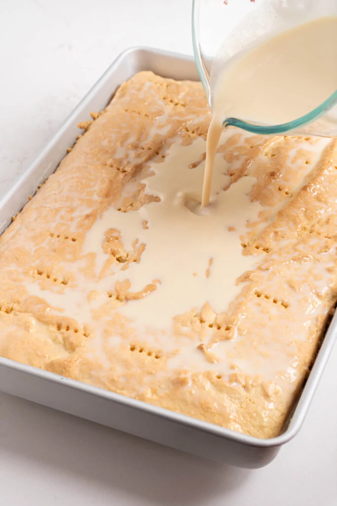 Once cooled, loosen the edges of the cake with a knife or spatula. Poke holes all over the surface using a fork or toothpick. Pour the milk mixture evenly over the cake. Cover and refrigerate for at least 3 hours, or overnight.