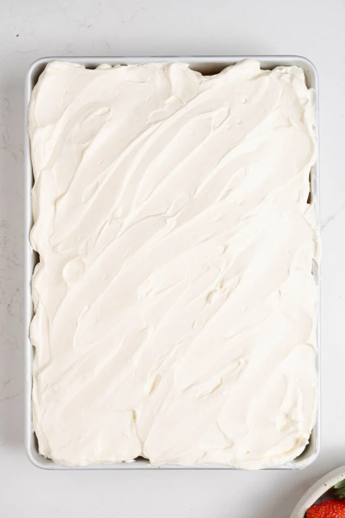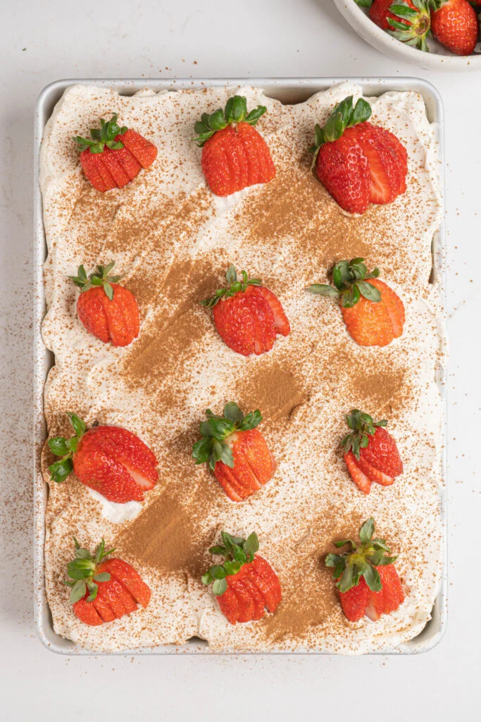 In a medium bowl, beat the heavy cream, powdered sugar, and vanilla extract until medium peaks form. Avoid overmixing. Spread or pipe the whipped cream over the chilled cake. Garnish with cinnamon and sliced strawberries if desired.